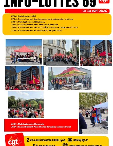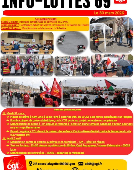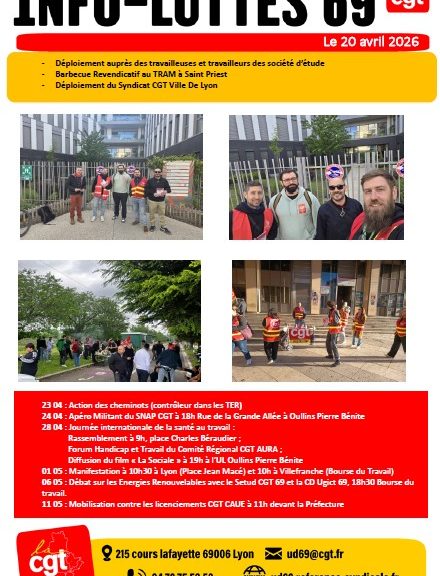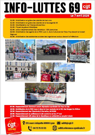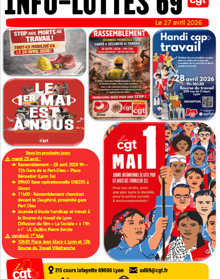 Cher.es Camarades, Vous trouverez ICI le tract UD CGT 69 pour le 1er mai 2026 Lyon : 10h30 Place Jean Macé Villefranche : 10h Bourse du Travail La CGT le martèle, le 1er mai n’est pas n’importe quel jour férié ! C’est la journée internationale de lutte pour les droits des travailleuses et des travailleurs, gagnée dans le sang. Jamais la CGT ne se laissera voler ce symbole de hautes luttes, pour la classe des travailleuses et travailleurs ! L’ensemble des organisations syndicales ont ainsi réussi […]