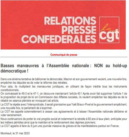 Réforme des retraites : Basses manœuvres à l’assemblée nationale: Non au hold up démocratique! Tweeter Partager Partager Vous trouverez ICI un communiqué de presse de la CGT. Pour rappel : Demain midi, jeudi 1er juin, rassemblement pour les libertés syndicales, devant la Préfecture (quai Augagneur) Mardi 6 juin: En grève et en manifestation ! Imprimer cet article Télécharger cet article 31 mai 2023