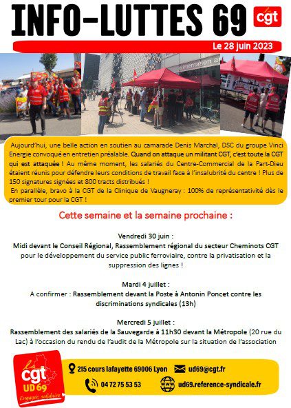 Info-luttes du 28 juin 2023 Tweeter Partager Partager Cher-e camarade, Tu trouveras ici l’Info-Luttes du jour, qui regroupe les initiatives de nos syndicats. Imprimer cet article Télécharger cet article 28 juin 2023