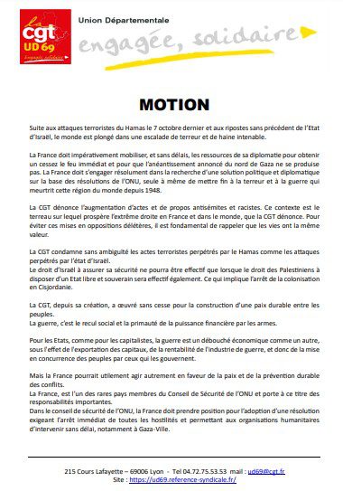 On ne répond pas à la guerre par plus de guerre, l’histoire nous enseigne que cela conduit à plus de désastres matériels et humains. Nous devons créer les conditions à ce que la paix triomphe. C’est pourquoi nous exigeons du gouvernement qu’il pèse pour l’arrêt des bombardements, un cessez le feu immédiat et le respect des résolutions de l’ONU. Motion de paix UD CGT ICI