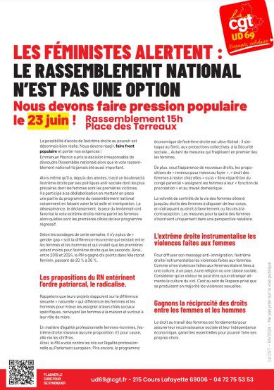 Vous trouverez ICI le tract d’appel au rassemblement des organisations féministes et syndicales, dimanche 23 juin à partir de 15h place Terreaux : L’Extrême droite est en situation d’accéder au pouvoir, il parait que ce serait la première fois de notre histoire… c’est oublié un peu vite la période de vichy. Derrière l’instrumentalisation des discours féministes à des fins racistes, le sexisme fait bel et bien toujours partie de l’idéologie conservatrice et réactionnaire des organisations d’extrême droite. Militantes, syndicalistes féministes, nous ne sommes pas dupes. Les votes du RN montrent que la défense des droits des femmes est le cadet des soucis. Faire barrage à ces idées et à celles et ceux qui les colportent, est une nécessité absolue, une extrême urgence. Nous ferons tout pour faire échec à l’extrême droite, dans les urnes en votant massivement pour un avenir qui permette l’émancipation et la liberté de toutes et tous, mais aussi dans la rue.