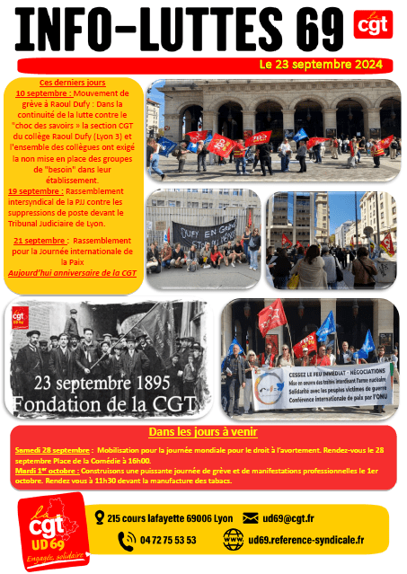 Info-Luttes du 23 septembre 2024 Tweeter Partager Partager Cher-e Camarade, Tu trouveras ICI l’Info-Luttes du jour. Fraternellement, UD CGT 69 Imprimer cet article Télécharger cet article 23 septembre 2024