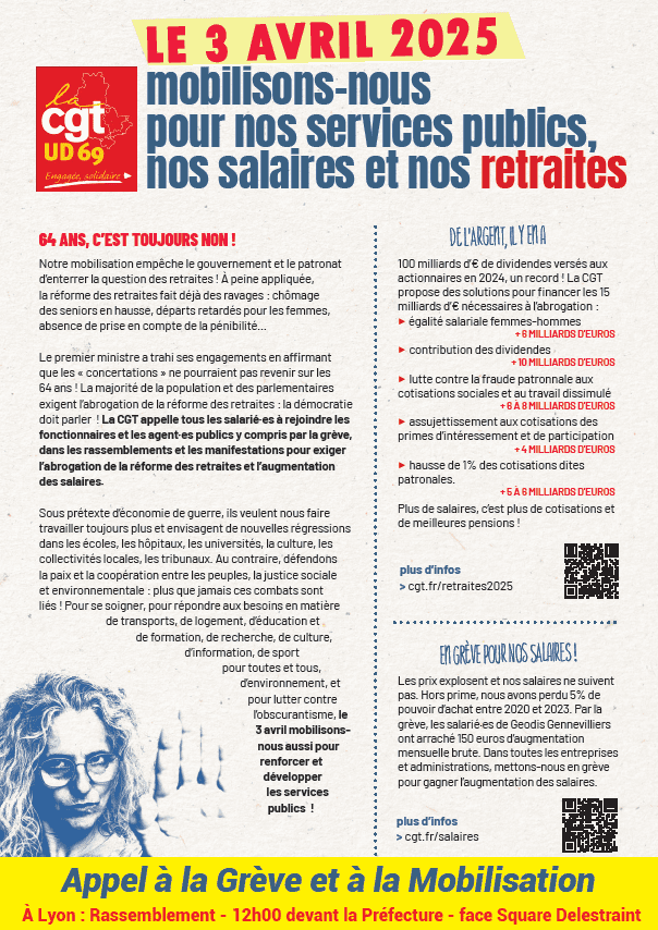 Cher-e Camarade, La CGT a acté jeudi 20 mars, sa sortie des concertations « Retraite » au regard de la surdité du gouvernement face aux exigences des travailleuses et travailleurs. Nous nous sommes engagés à amplifier le déploiement auprès des salarié-e-s et agent-e-s et à confédéraliser la journée d’action de l’intersyndicale des 3 versants de la fonction publique, en appelant, y compris par la grève, les travailleuses et travailleurs du secteur privé à se joindre à cette journée de mobilisation. La CGT, […]